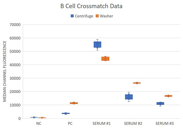 Laminar Wash technology demonstrates greater reproducibility between replicates compared to traditional centrifugation. Presented here is a flow cytometric crossmatch assay (FXCM), widely used in human leukocyte antigen (HLA) labs to predict donor-recipient compatibility. Using three test sera and two controls in eight replicates, Laminar Wash produced a lower coefficient of variance in B-cell median channel fluorescence (MCF) values of 7.9%, versus 12.4% in the centrifugation method. Higher MCF values on the positive control also gave greater FCXM sensitivity, which is highly valued in clinical settings.