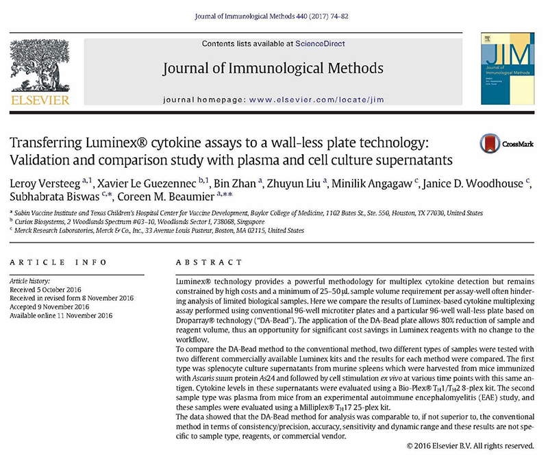Transferring LuminexĀ® cytokine assays to a wall-less plate technology: Validation and comparison study with plasma and cell culture supernatants.