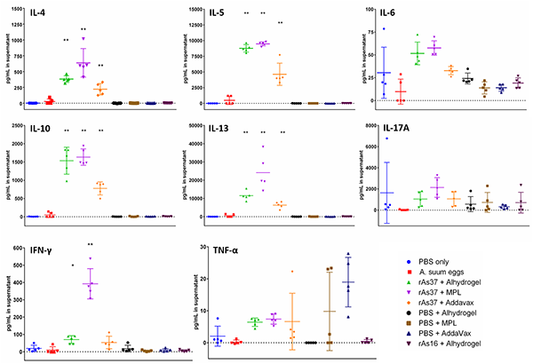 Cytokine profiles of BALB/c mice immunized with rAs37 formulated with Alhydrogel, MPL, and AddaVax. Cytokine levels were determined in supernatants of splenocytes after being re-stimulated with rAs37 (25 μg/ml) for 48 hours. Cytokine values measured in unstimulated samples were subtracted from the cytokine values from the corresponding rAs37 re-stimulated samples. Data are presented as means and individual values for each group (n = 5). *p< 0.05, **p< 0.01.