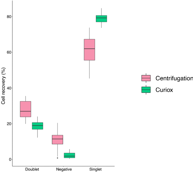 Samples processed with a Curiox Laminar Wash system yield fewer doublets, fewer negative results and higher numbers of singlets. Data courtesy of ImmunAI, adapted from Dr. Antonio Montalbano’s webinar with Curiox Biosystems.