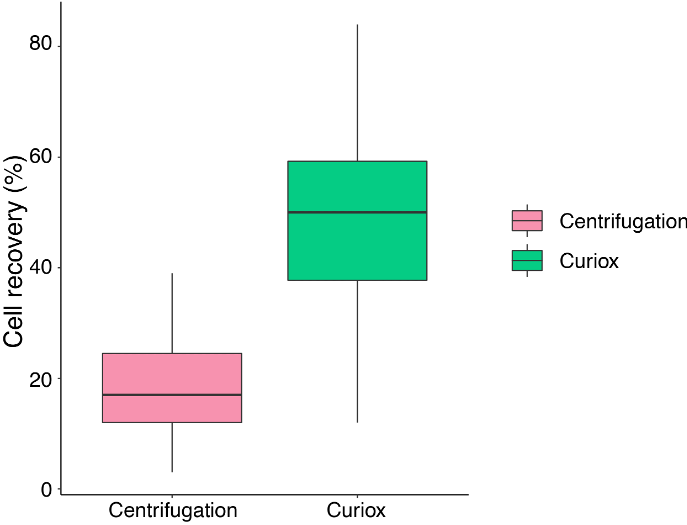 Laminar Wash consistently retained higher numbers of cells, compared to traditional centrifuge-based methods. This is especially true for samples that have a very low number of cells. Data courtesy of ImmunAI, adapted from Dr. Antonio Montalbano’s webinar with Curiox Biosystems.